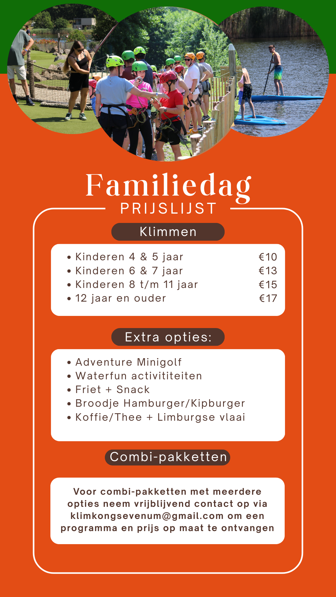 Iedere familie heeft andere wensen en behoeften. In het contact zorgt Klimkong ervoor dat ieder programma afgesteld wordt op een zo leuk mogelijk ervaring voor de hele familie!
